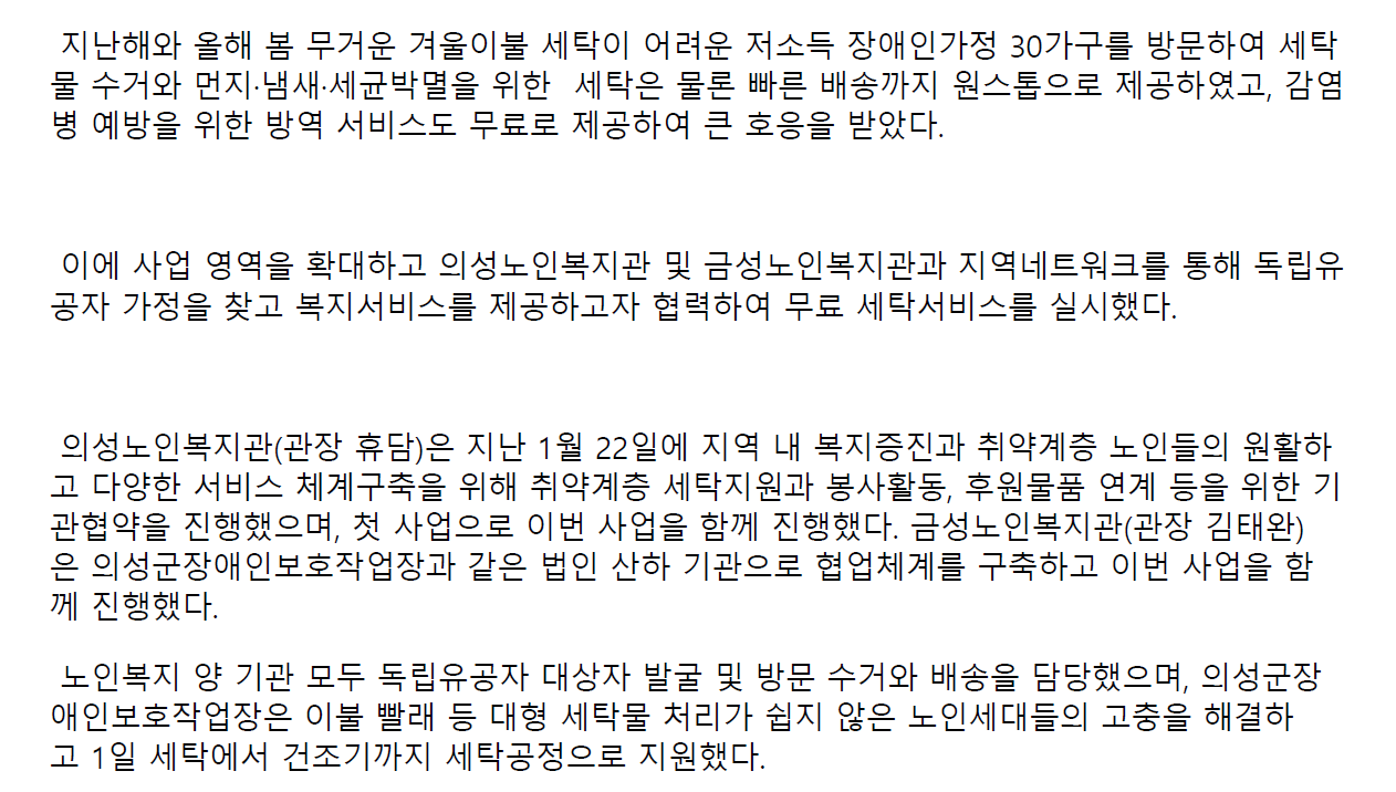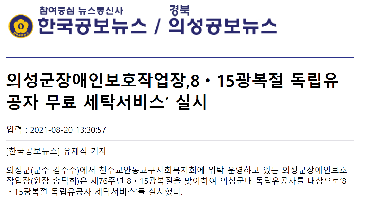 의성군장애인보호작업장에서는 제76주년 8・15 광복절을 맞이하여 의성군 내 독립유공자를 대상으로 '8・15 광복절 독립유공자 무료 세탁서비스' 를 실시하였습니다.